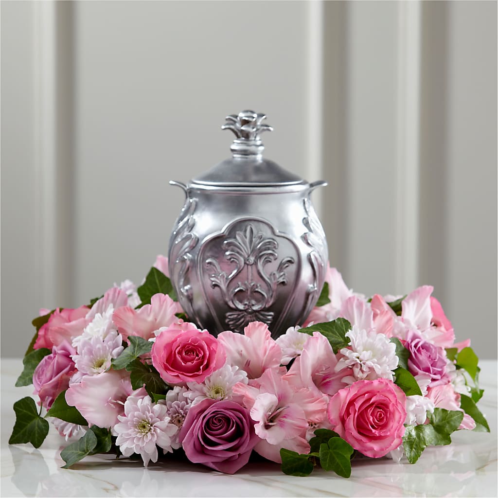 A wreath of lovely, fresh, pastel blossoms makes a bright and blushing setting for an urn containing the cremated remains of a loved-one for visitation, a funeral or memorial service. The wreath is hand-fashioned of lavender cushion pompons, pink gladiolus and pink and lavender roses atop a base of variegated greens with a flat bottom for stability on a tabletop or altar. It can also be used to enhance the display of religious statuary, a meaningful photograph or memento or a candleholder.